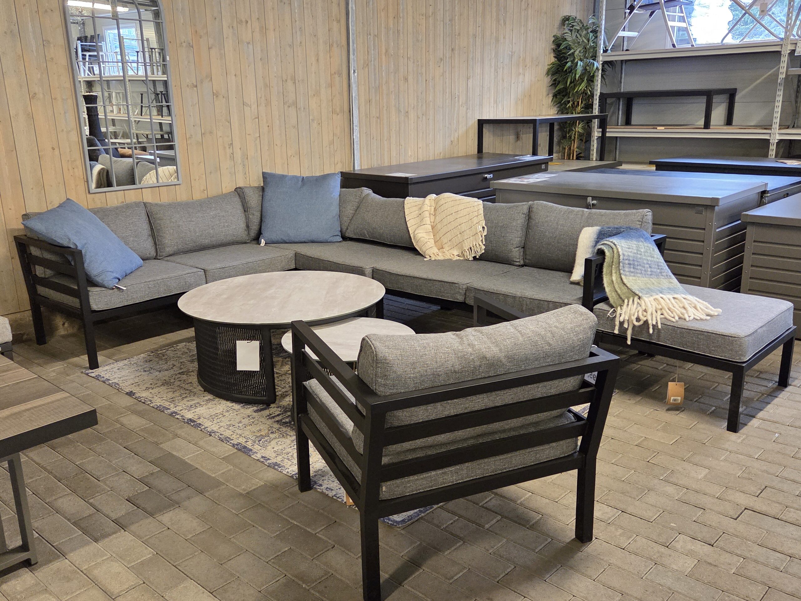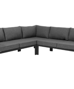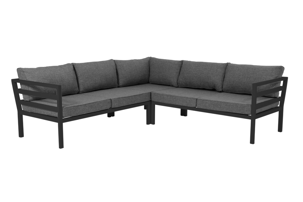 Weldon hjørnesofa er en modulgruppe som selges som liten eller stor utgave, forskjellen er en midtdel ekstra i den store. Rammen er svart og putene er grå.
